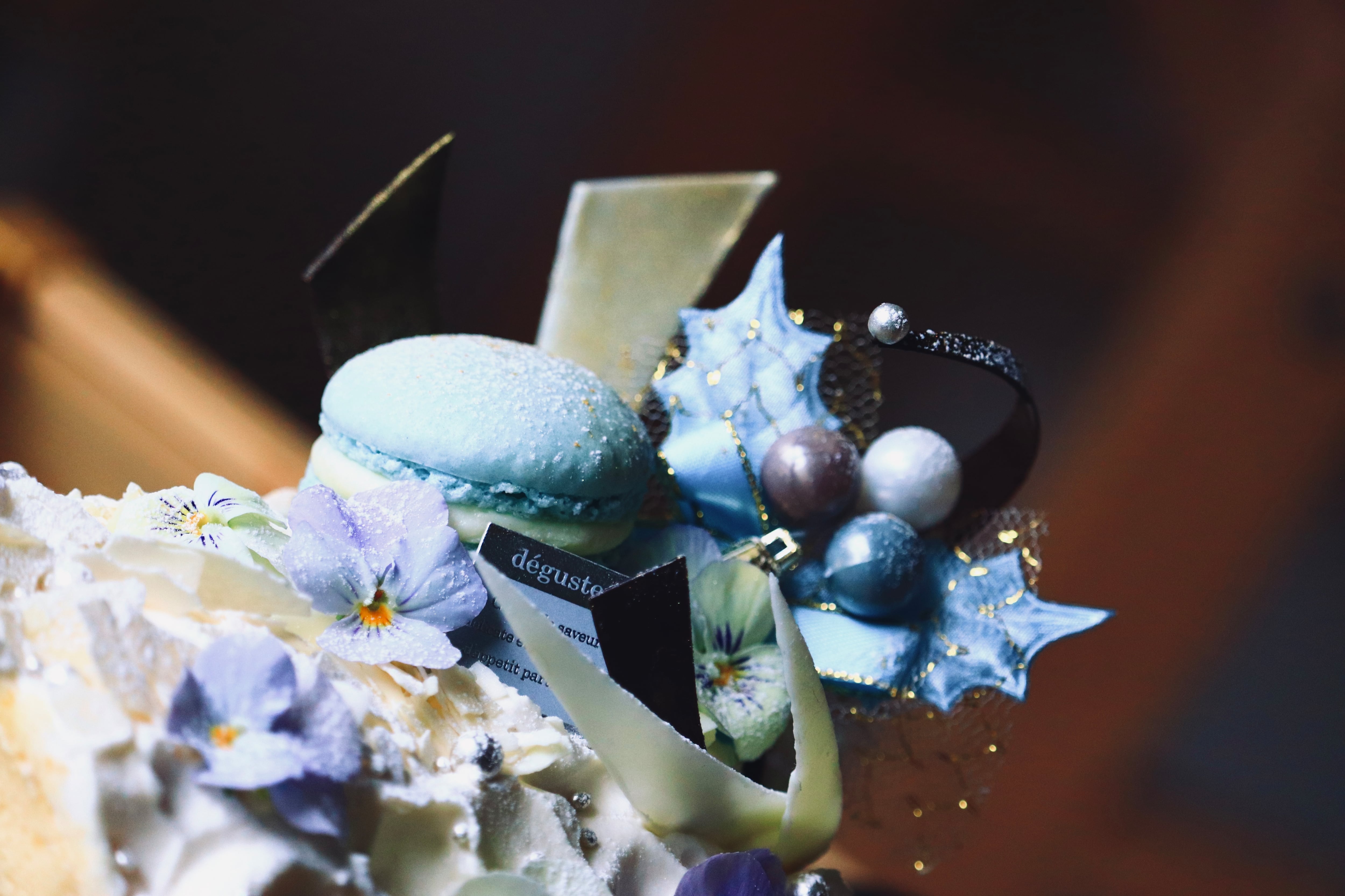 トッピングにはビオラの花びらと空色のマカロンを。涼やかな味わいのヨーグルトガナッシュを挟んだマカロンと、素朴で清々しい香りのビオラを添えることで、可憐でいたいけな印象を演出しています。